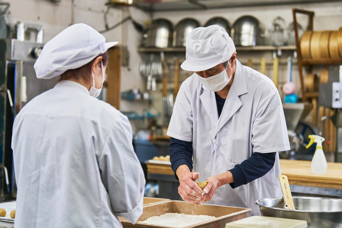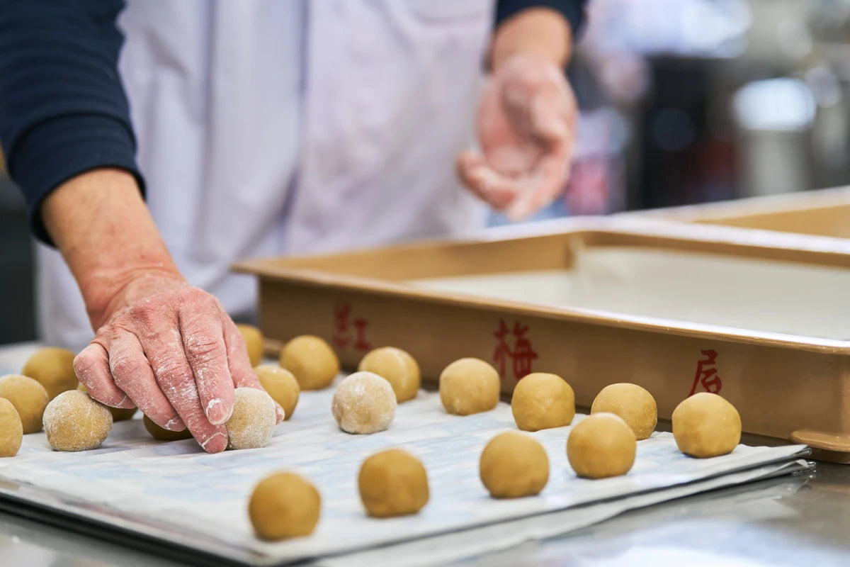 和菓子に欠かせない「あんこ」の美味しさ。その味を決めるのは、素材と仕込みの丁寧さです。紅梅屋では、手炊きにこだわり、一粒一粒に想いを込めた自家製餡をつくっています。 選び抜かれた北海道産の小豆を、前日から水に漬け、じっくりと吸水させます。当日は朝早くから小豆を仕込み、丁寧に煮炊きを始めます。熱伝導率の良い銅釜を使い、直火で火加減を細かく調整しながら、手間ひまかけて炊き上げます。ムラなく均一に仕上げることで、つややかでふっくらとした餡が炊きあがります。 こし餡は、そこから手作業できめ細やかに裏ごしをして、片時も手を休めず餡を練り上げることで、まろやかで口当たりの良い餡が出来上がります。 素材の味を引き立てる自家製餡は、紅梅屋の和菓子を支える大切な存在です。ひと口食べれば、豆本来の風味とやさしい甘さが広がります。職人の伝統の技と心を込めた自家製餡を、ぜひご賞味ください。